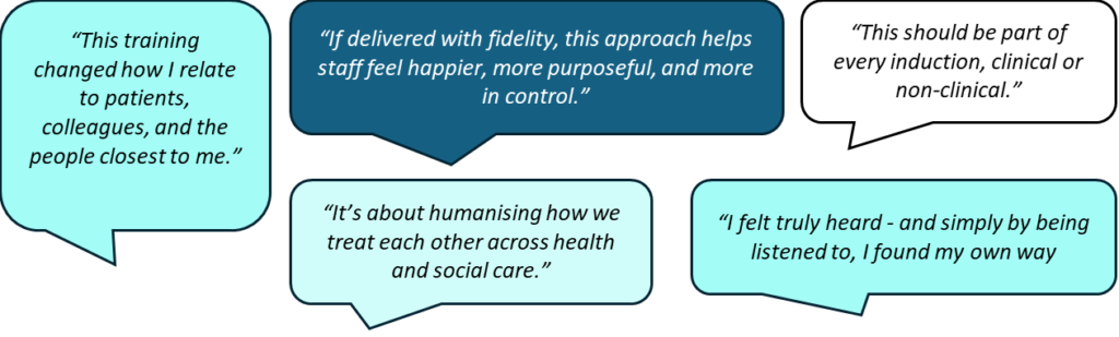 For the person listening: it offers an ethical way to listen to others. This approach helps reduce the emotional burden and the feeling of needing to fix others. As a result, it supports wellbeing and job satisfaction. It also encourages a sense of mutual understanding in both work and personal life.